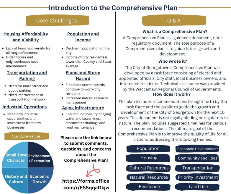 Most, if not all, Cities consider the Comprehensive Plan as so vital for their future that they devote significant resources, including Website content, to communicate all aspects of the planning process and accountabilities. A local example is Moncks Corner. https://monckscornersc.gov/government/community-development/comprehensive-planning. In contrast, Georgetown’s site barely makes any reference to the Comprehensive Plan and it is not even described in the responsibilities of the Planning Commission. https://www.georgetownsc.gov/governmental_services/boards___commissions/planning_commission.php